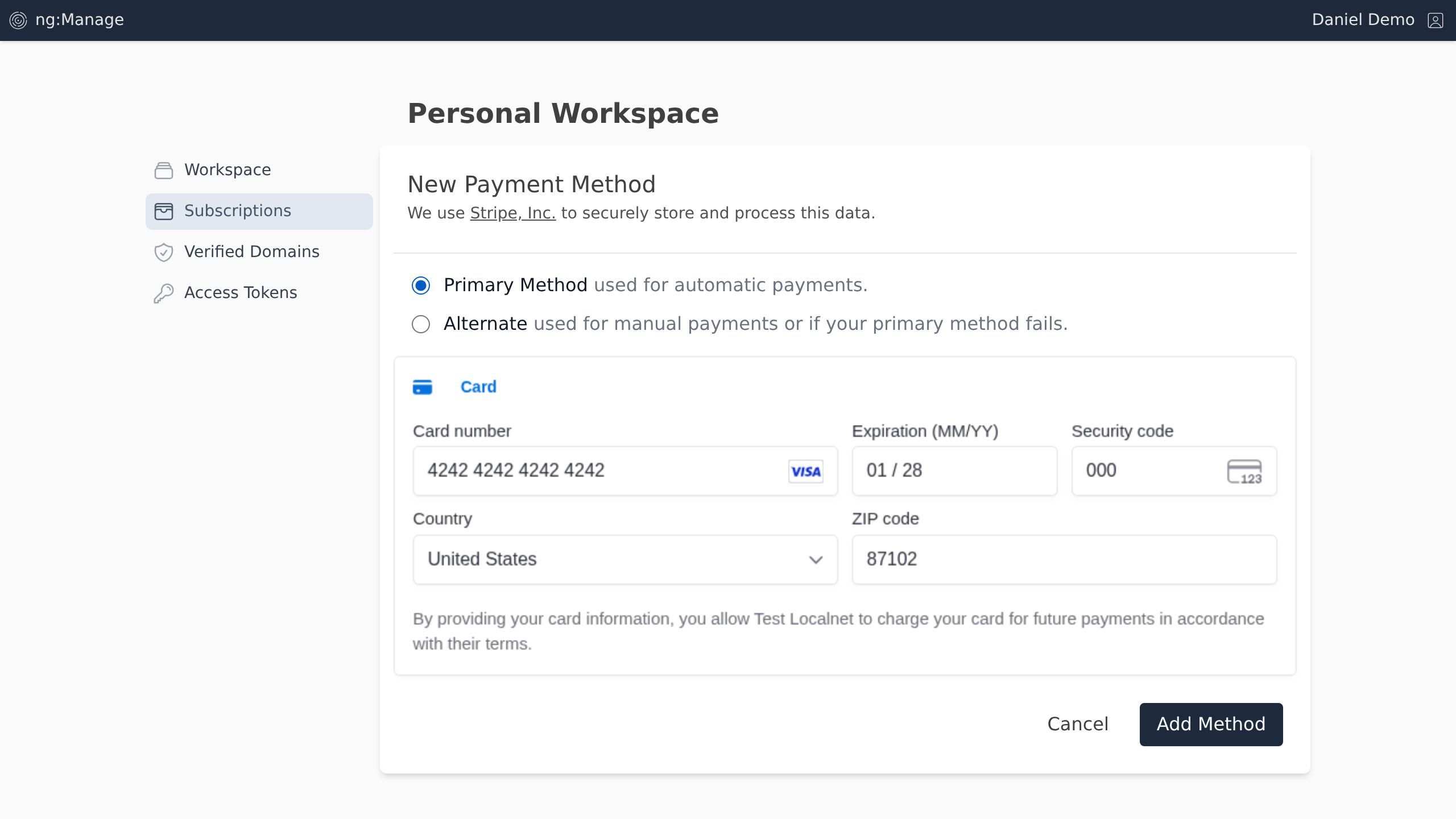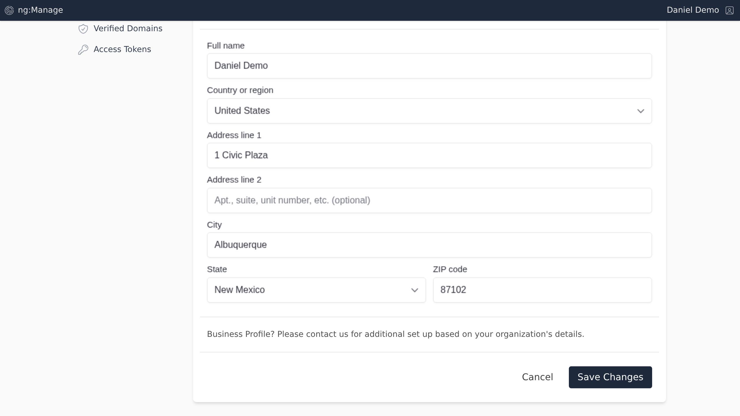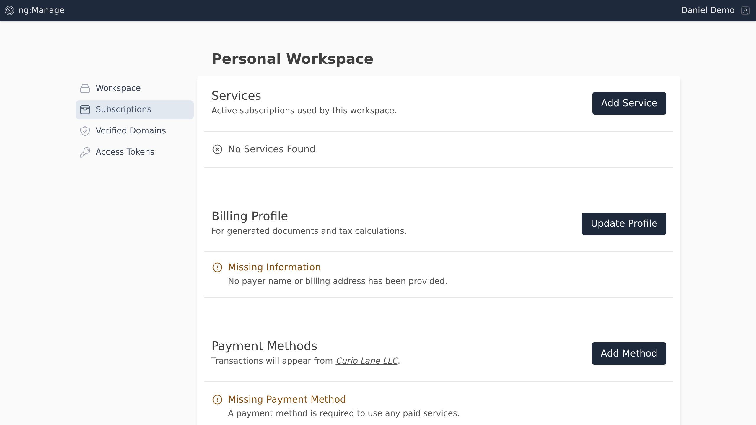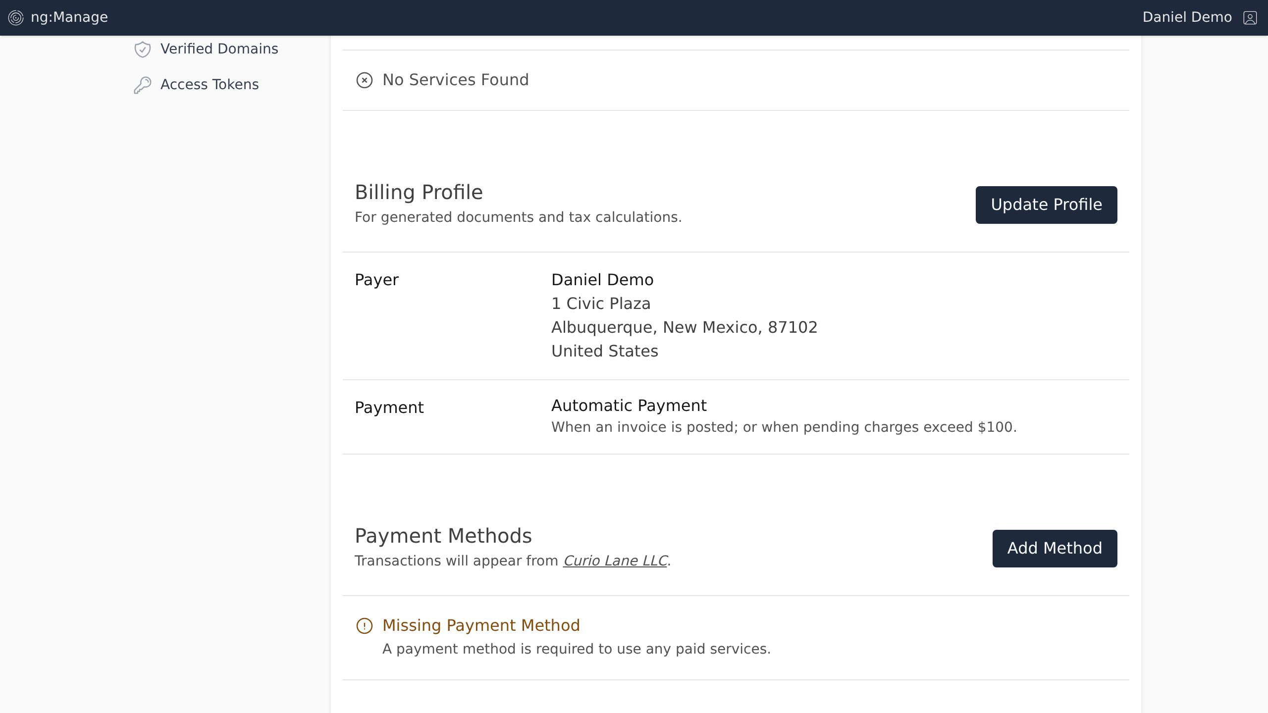 Once saved, you can add paid services or return at any time to update your billing profile.