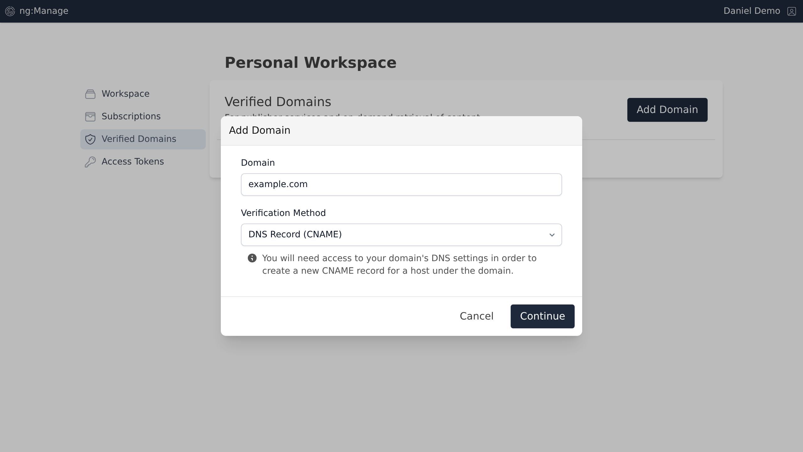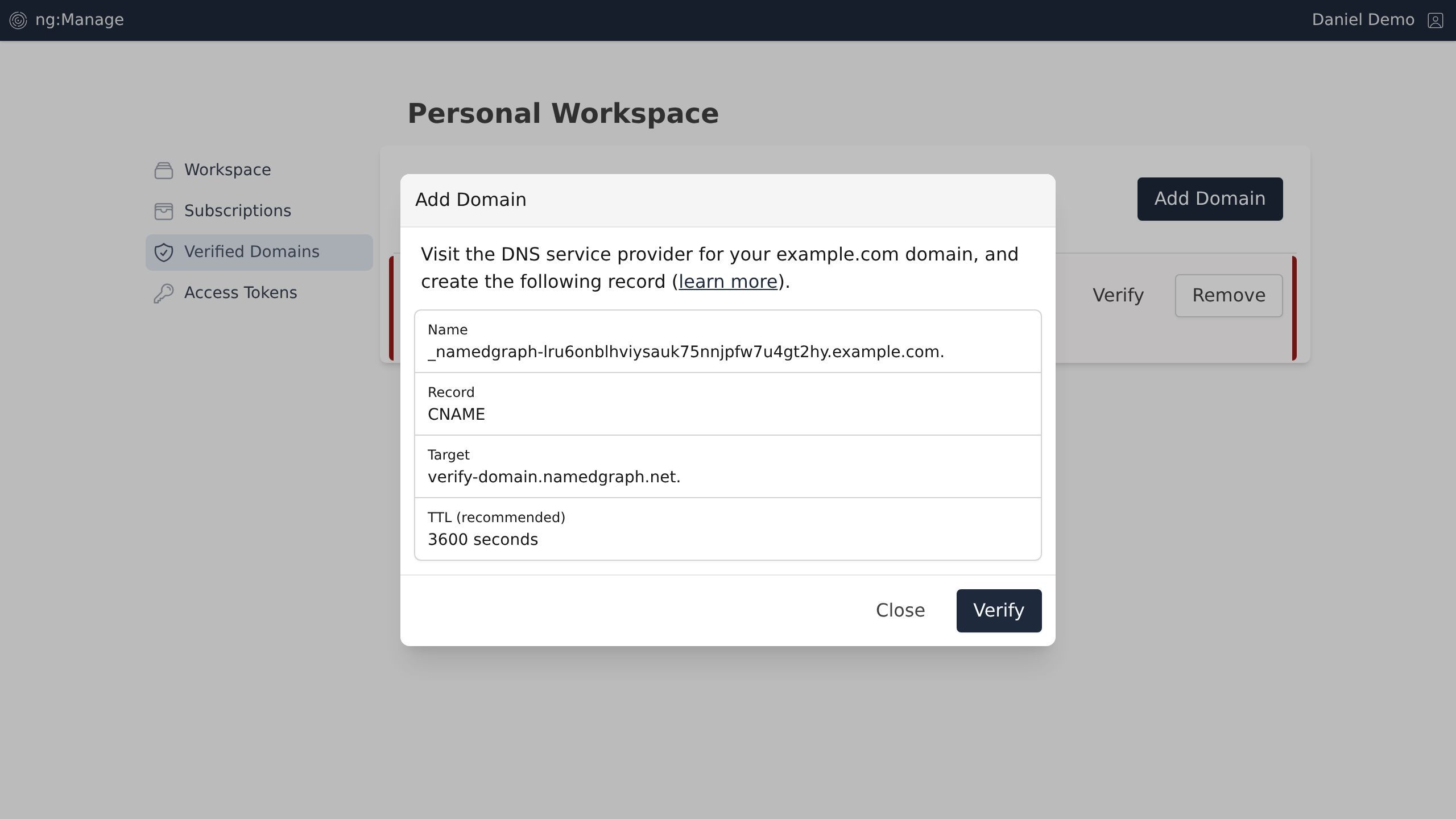 Once the DNS record as been added, it may take some time to propagate (ranging from seconds to days). We will automatically monitor the verification, but you may also try a manual verification, and click the Verify button.