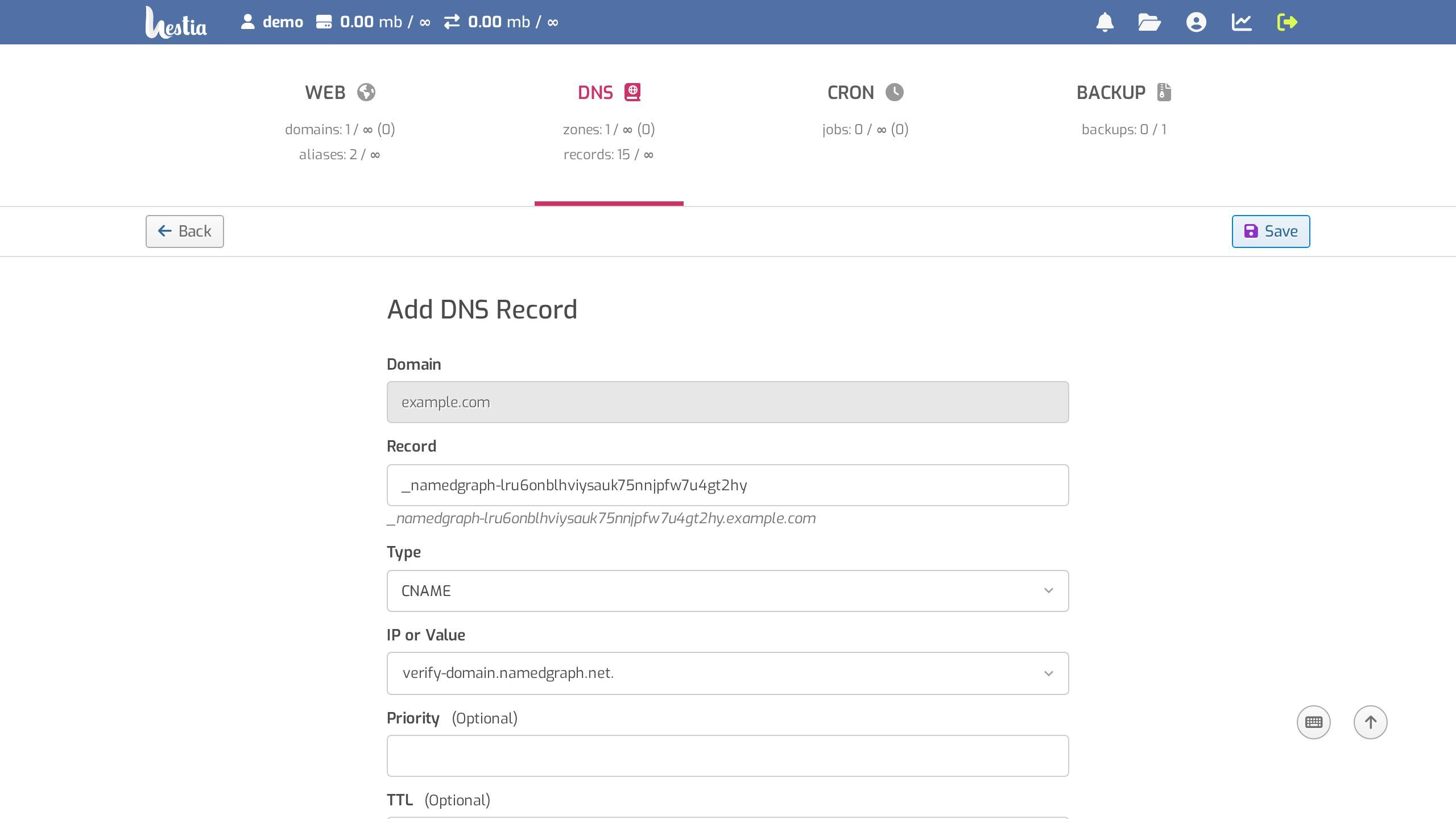 Visit your domain's DNS settings to create a new CNAME record based on your assigned properties. Terms and steps vary slightly depending on the DNS provider, but you will typically find a form similar to the following.